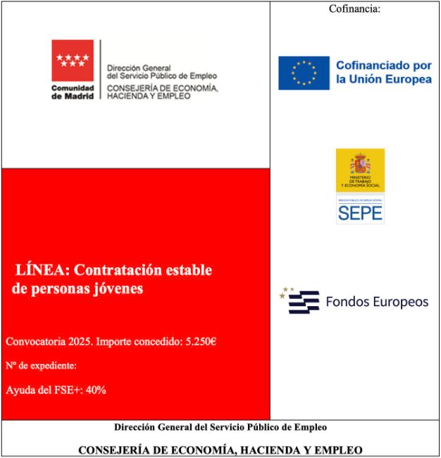 Gracias a una subvención recibida por parte de la Consejería de Economía, Hacienda y Empleo de la Comunidad de Madrid, a través del Programa para el Fomento de la Contratación, dentro de su Línea 2: "Contratación Estable de Personas Jóvenes", hemos iniciado un proceso de incorporación de jóvenes talentos a nuestro equipo.